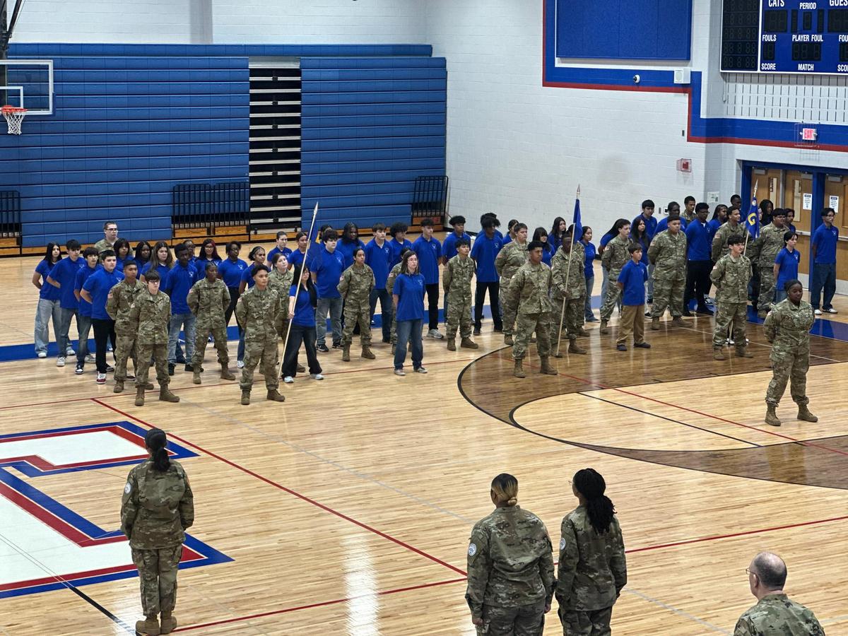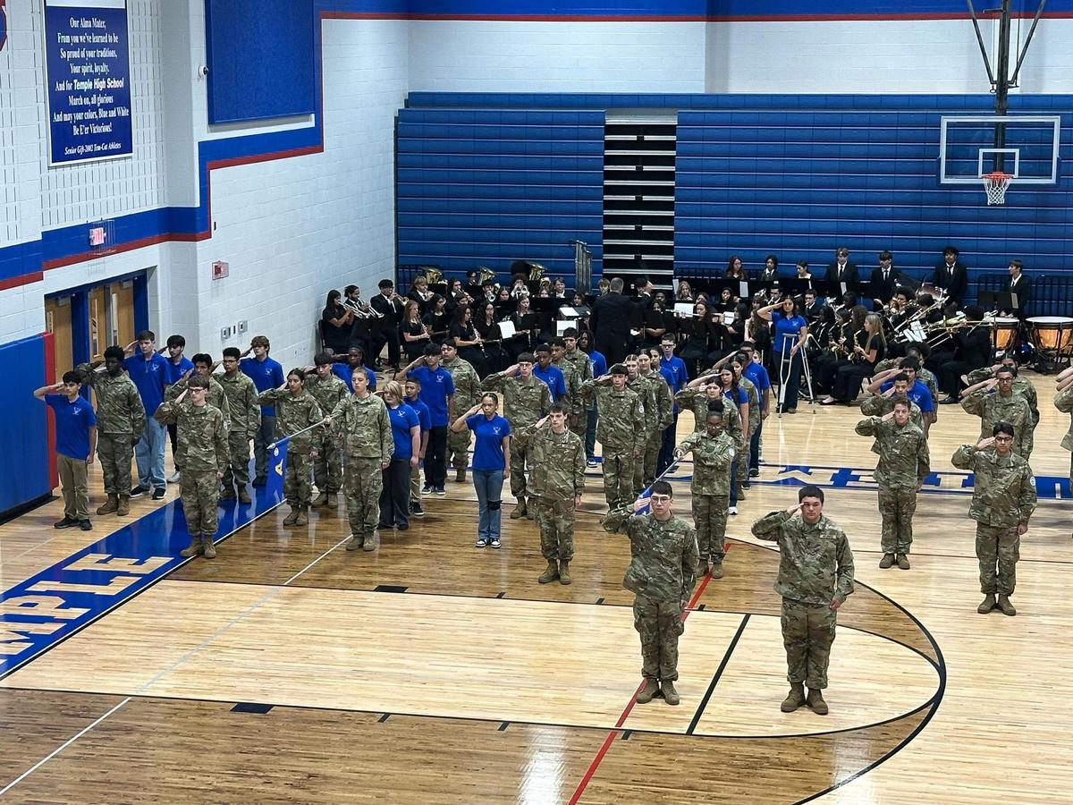 TEMPLE, Texas — The Temple High School Air Force JROTC honored veterans by holding a Veteran’s Day Pass-In-Review ceremony Monday (November 10) as a salute to those who served. Approximately 175 student cadets participated in the event. The first Pass-In-Review at Temple High School was held in 1995, making this the 31st annual Veteran’s Day recognition for Temple HS JROTC. The ceremony was held at the THS Gymnasium in front of a crowd of veterans, family members, classmates, staff, and community members. The Temple High School Wind Ensemble provided the music for the ceremony.